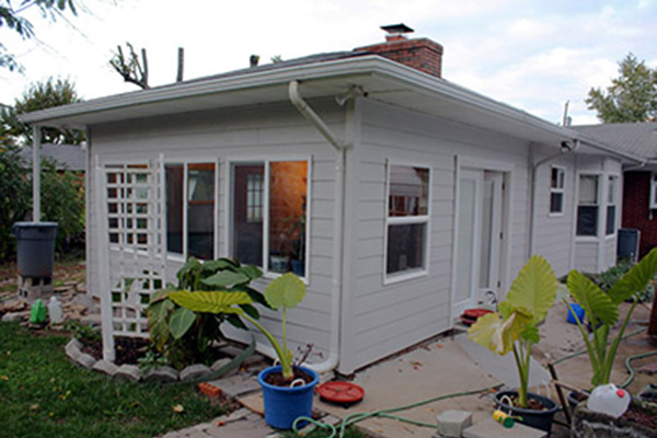 Construction of the "Sunroom Addition" was started during the hot and humid Kentucky summertime. We had decided to mimic the original addition built 20 years prior, adding a hip roof profile to the new west end. It was decided that to keep the look fluid, the outdated aluminium siding on the old addition would be replaced at the same time with the concrete fiber board siding used to wrapping the new addition.